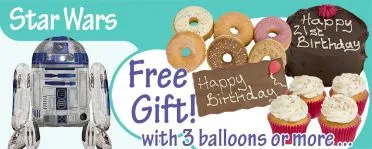 Choose from a personalised birthday cake, cupcakes, personalised chocolate bar or doughnuts worth £10.00! Add some excitement and magic to your celebration with our Licensed Star Wars birthday balloons, fully inflated and delivered to any UK address with balloon weights and ribbon included. Choose your preferred delivery date and don't miss out on the fun! Shop now for the best selection of Star Wars birthday balloons delivered in a box.