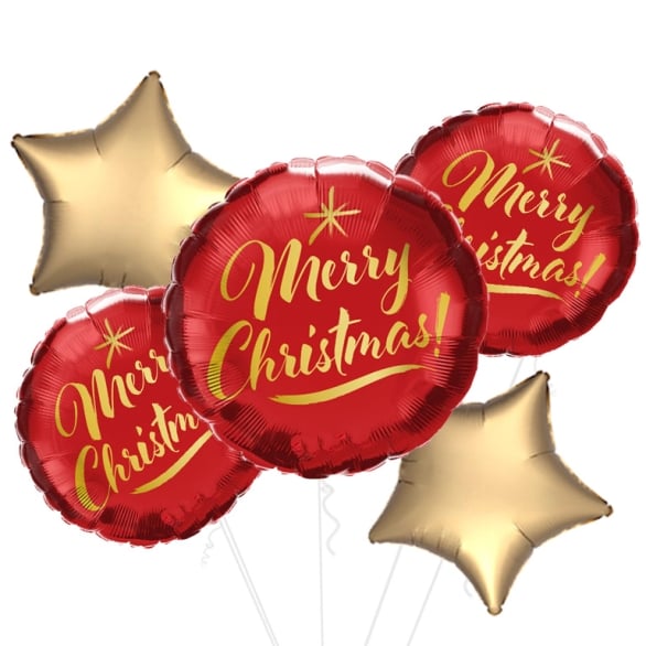 A classic Christmas balloon with golden script Merry Christmas message on a red foil balloon. This elegant design would make the perfect gift to send Christmas wishes and provide some early cheer.