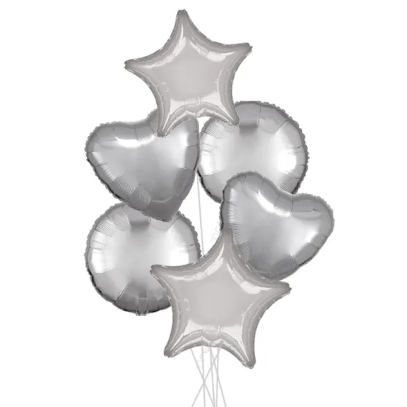 These bouquets of solid colour balloons arrive in bunches of 6, in a mixture of round, heart and star shapes. Each bouquet arrives fully inflated and tied to weights with curly ribbon, ready to use for your party or event.