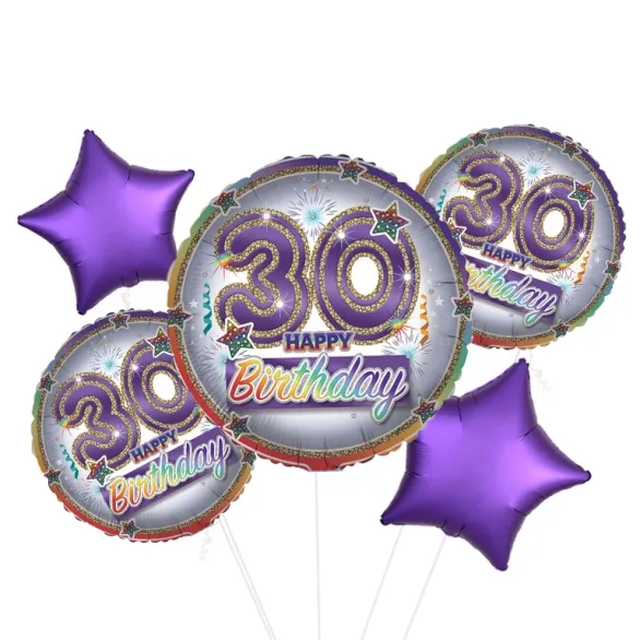 This fashionable balloon design will ensure that your Birthday surprise for a 30 year old is well received. This balloon has a different design printed on each side but includes, gift parcels, ear bud and mobile phone motifs for gadget users, .